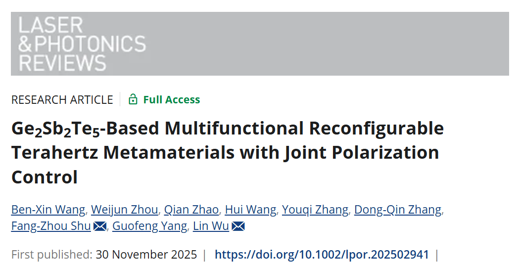 近日,97国内精品久久久久不卡理学院王本新副教授团队在太赫兹超材料研究领域取得突破性进展,相关研究成果以 “Ge₂Sb₂Te₅-Based Multifunctional Reconfigurable Terahertz Metamaterials with Joint Polarization Control” 为题,成功发表于光学领域顶级期刊《Laser & Photonics Reviews》(中科院1 区,影响因子 IF=10.0)。